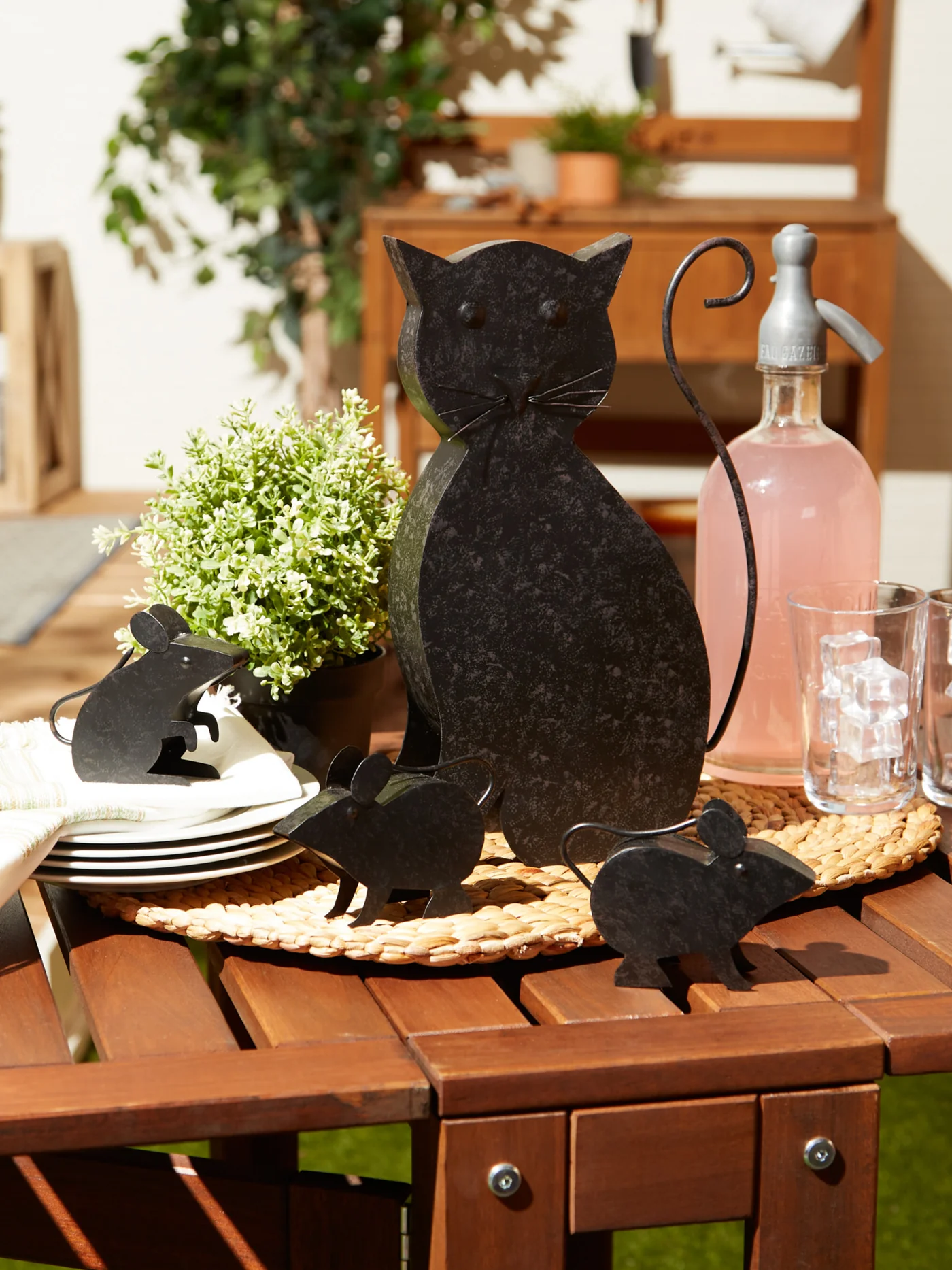 • Garden cat keeps an eye on the mice in this charming country garden sculpture set.